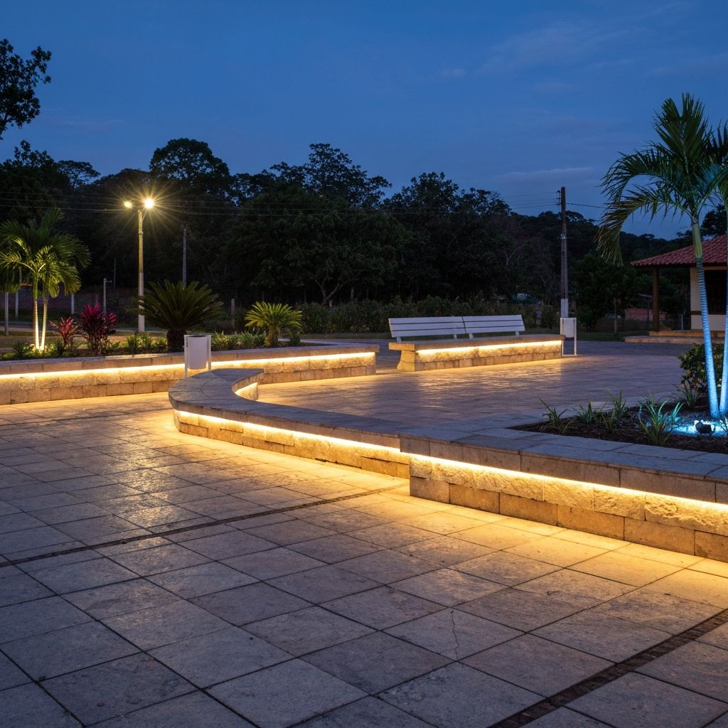 Projeto luminotecnico e execucao da iluminacao da praca publica com tecnologia LED de alta eficiencia e design integrado a paisagem.